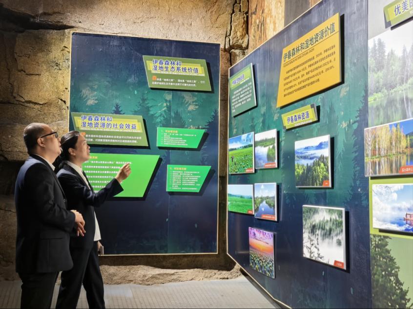 随后,一行人进入森林博物馆展厅,深入了解伊春林区从“伐木经济”到“生态保护”再到“绿色转型”的发展历程。从早期林业工人使用的锯斧工具、记录林区开发的老照片,到如今展现“绿水青山就是金山银山”实践成果,大家全方位感受伊春在生态保护与产业协同发展中取得的成绩。