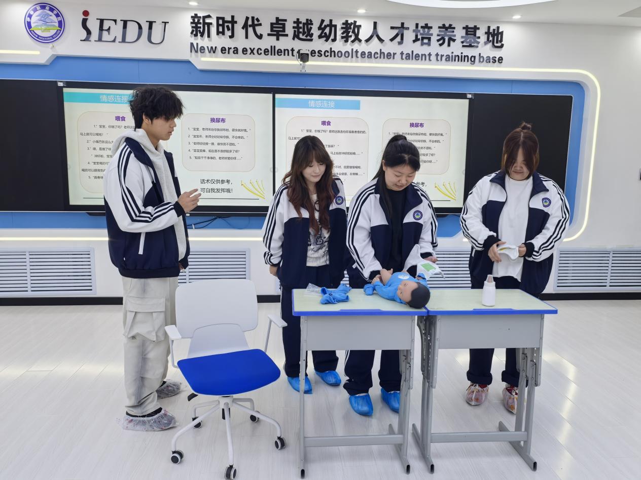 活动中,王晶以“虚实结合、理实一体”的双导师课堂模式,为学生带来了别开生面的“开学第一课”。课程围绕婴幼儿照护、早期教育等专业领域,结合人工智能仿真婴儿等前沿教具,开展了情景化、互动式的实训体验。学生通过操作智能仿真婴儿,深入理解婴幼儿行为反应与护理要点,在实践过程中强化了对专业知识的掌握,也切身感受到科技赋能教育的创新魅力。
