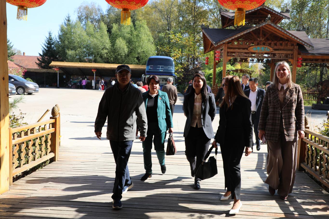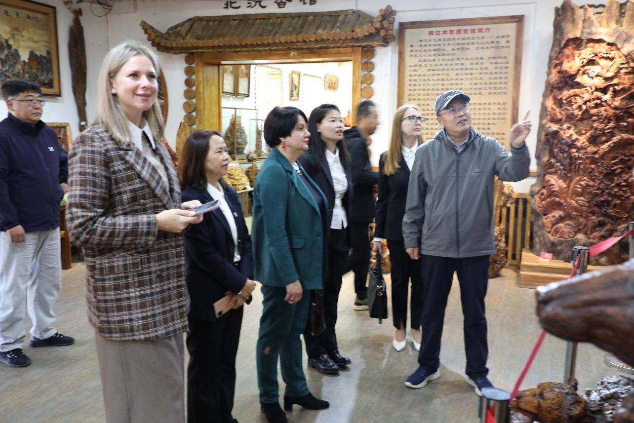 随后,巴热诺娃一行重点参观了森林文化艺术创意展示中心。走进展示中心,一件件精美的木艺作品让人眼前一亮,北沉香摆件纹理独特、香气淡雅,木拼画作品色彩层次丰富、画面栩栩如生,山核桃创意作品则将山核桃变废为宝,展现出浓郁的北方森林文化特色。