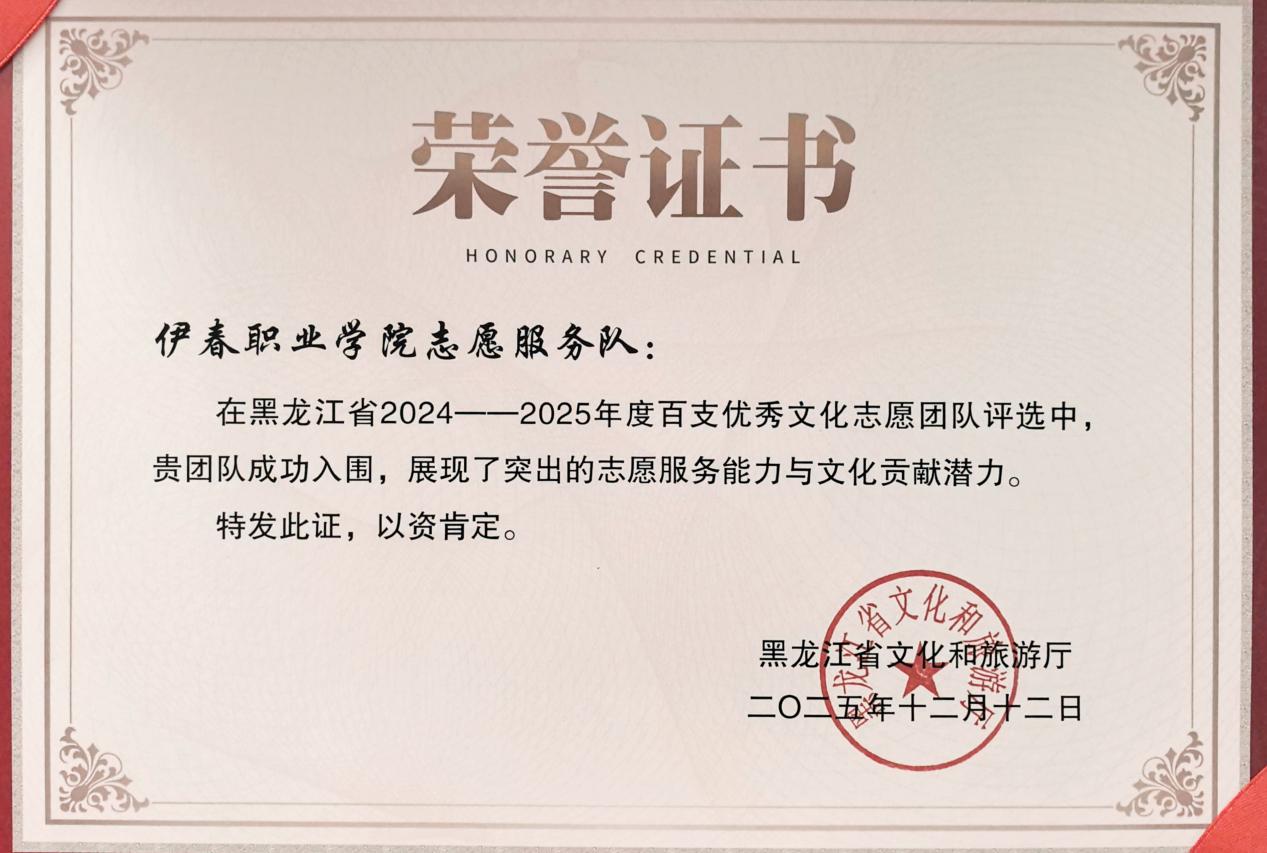 伊春职业学院志愿服务队凭借扎实的文化服务实践、突出的志愿执行能力被评为黑龙江省文化和旅游厅2024—2025年度百支优秀文化志愿团队,于12月12日获颁荣誉证书。这份荣誉是对学校文化志愿服务工作的高度认可,更是我校青年学子践行志愿精神、深耕文化服务的生动褒奖,也彰显了学校以志愿服务为载体,将文化育人与实践育人深度融合的育人成效。