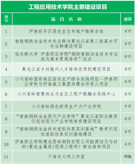工程应用技术学院积极参与国家、省重大项目建设,近五年年工程应用技术学院申请获批或承接了省、市级项目13项,包括黑龙江省高等学校资源型产业发展和装备制造业紧缺人才培养培训基地项目、黑龙江省乡村振兴人才培养优质校、钢铁智能冶金技术专业成为高本贯通培养首批试点专业、智能钢铁冶金技术虚拟仿真实训基地获批省级职业教育示范性虚拟仿真实训基地建设等十余个项目,获得省和国家各项支持奖补资金达2500余万元。