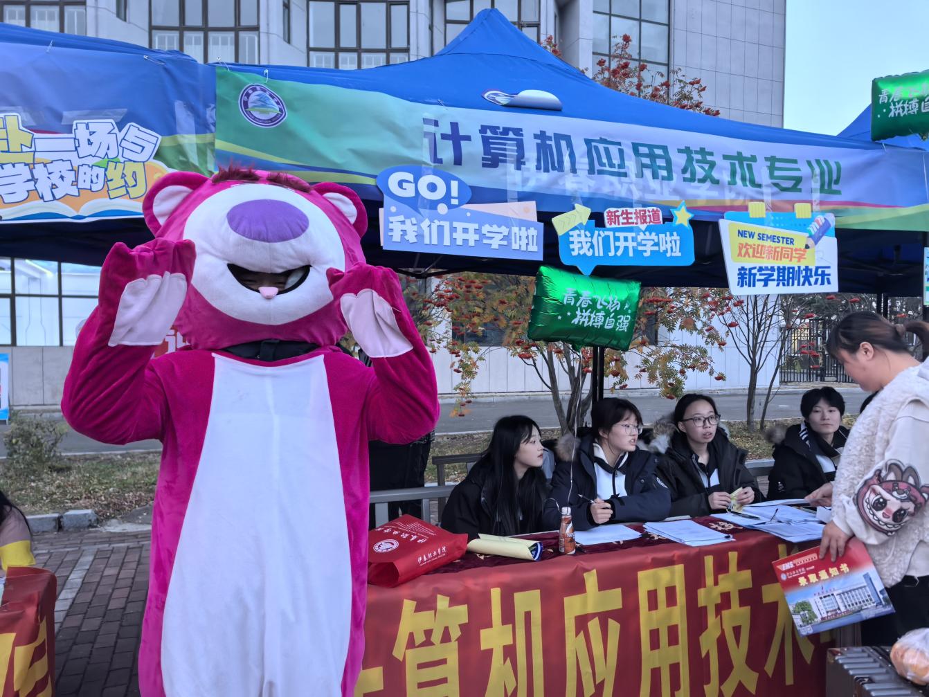 迎新现场,可爱的草莓熊人偶穿梭其间,与新同学热情互动、合影留念。新生手持“开学啦,迎新学期”、“勇敢追梦,不负时光”的主题手牌,在镜头前定格下入学的喜悦瞬间。