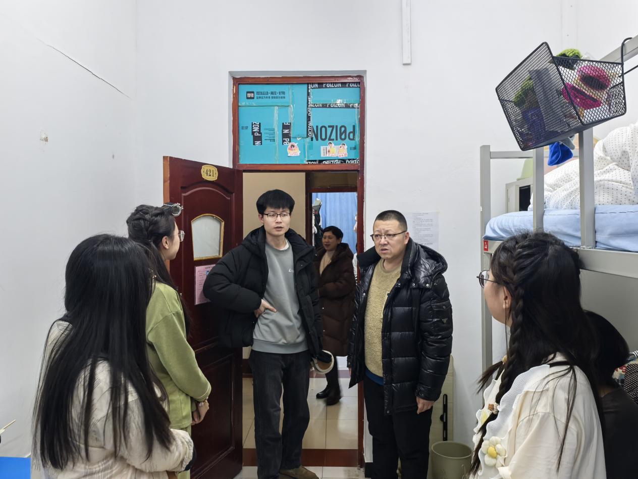 为强化学生离校前宿舍的安全管理、关心学生期末学习和生活状态,12月25日晚,我院党支部书记王洪锦,副书记马良,辅导员刘闯、孔令辉先后深入第四学生公寓、第八学生公寓,开展期末宿舍走访活动。