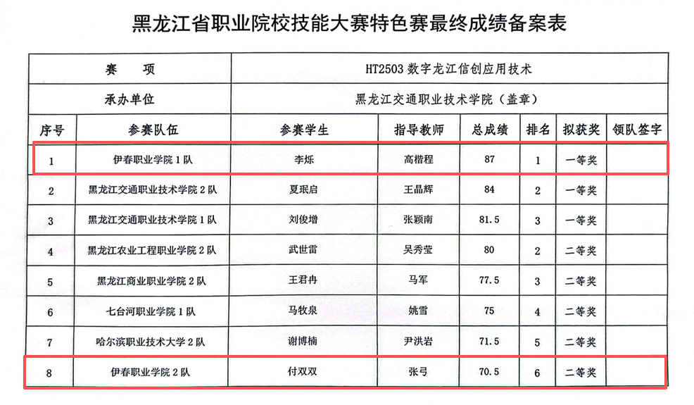 近日,2025年黑龙江省职业院校技能大赛特色赛“数字龙江信创技术应用”赛项在哈尔滨落下帷幕。由我院计算机应用技术学院高楷程老师带队,2024级计算机应用技术专业李烁、付双双同学组成的参赛队伍凭借扎实的专业功底与出色的团队协作,从全省30支精英赛队中脱颖而出,李烁成功斩获高职组一等奖全省第一名,付双双斩获高职组二等奖,我院再添荣誉!