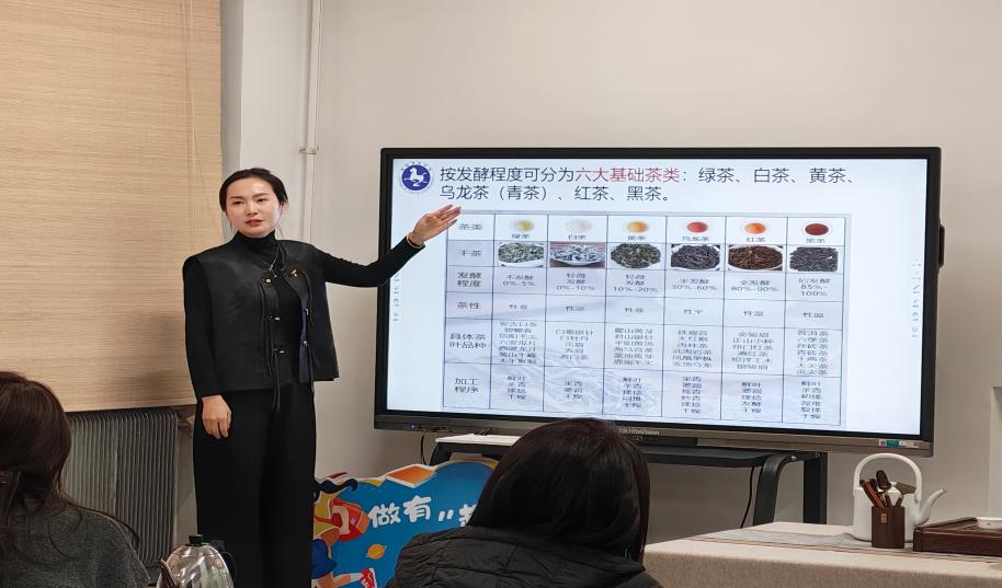 课堂上,王廷从茶的历史渊源、分类鉴别讲起,逐步深入到冲泡技巧、礼仪规范及品茗心境。她不仅进行了精彩的茶艺展示,还指导青年们亲手体验,在氤氲茶香中感受中华传统茶文化的独特魅力。现场互动频繁,气氛热烈。