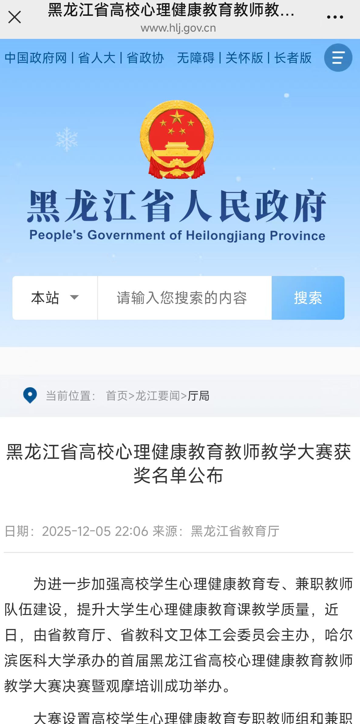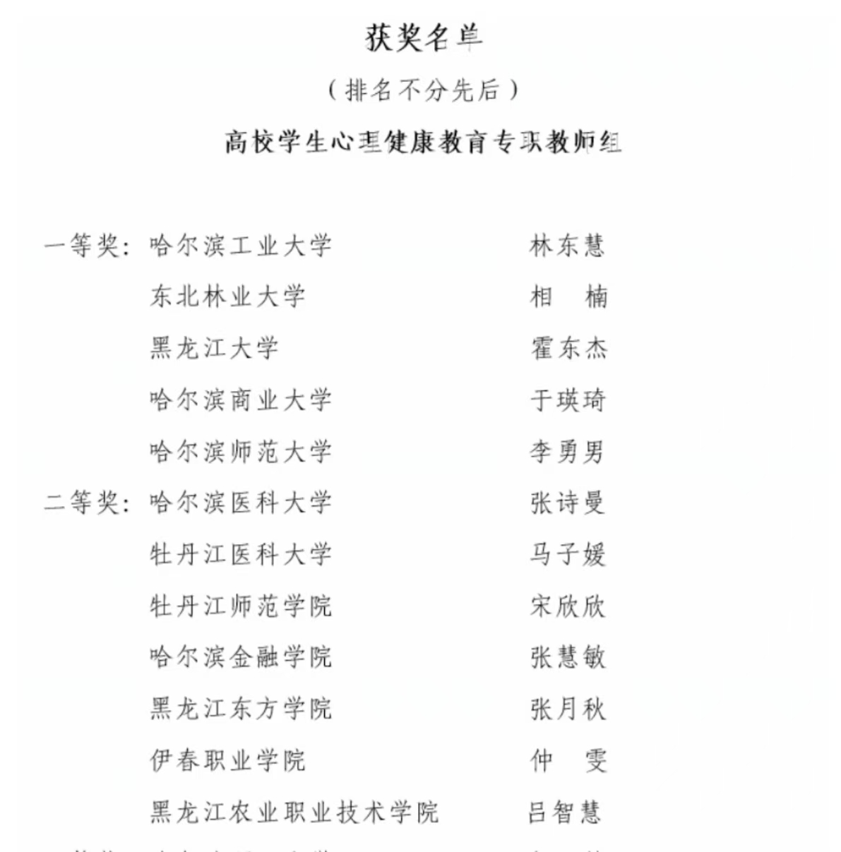 近日,由省教育厅、省教科文卫体工会委员会主办,哈尔滨医科大学承办的首届黑龙江省高校心理健康教育教师教学大赛决赛暨观摩培训圆满落幕。全省78所本、专科院校心理健康教育教师代表集体观摩了此次比赛。我校公共教学部心理健康教研室(心理健康教育中心)教师仲雯,凭借精湛的教学技艺与创新的教学设计,斩获专职教师组二等奖。