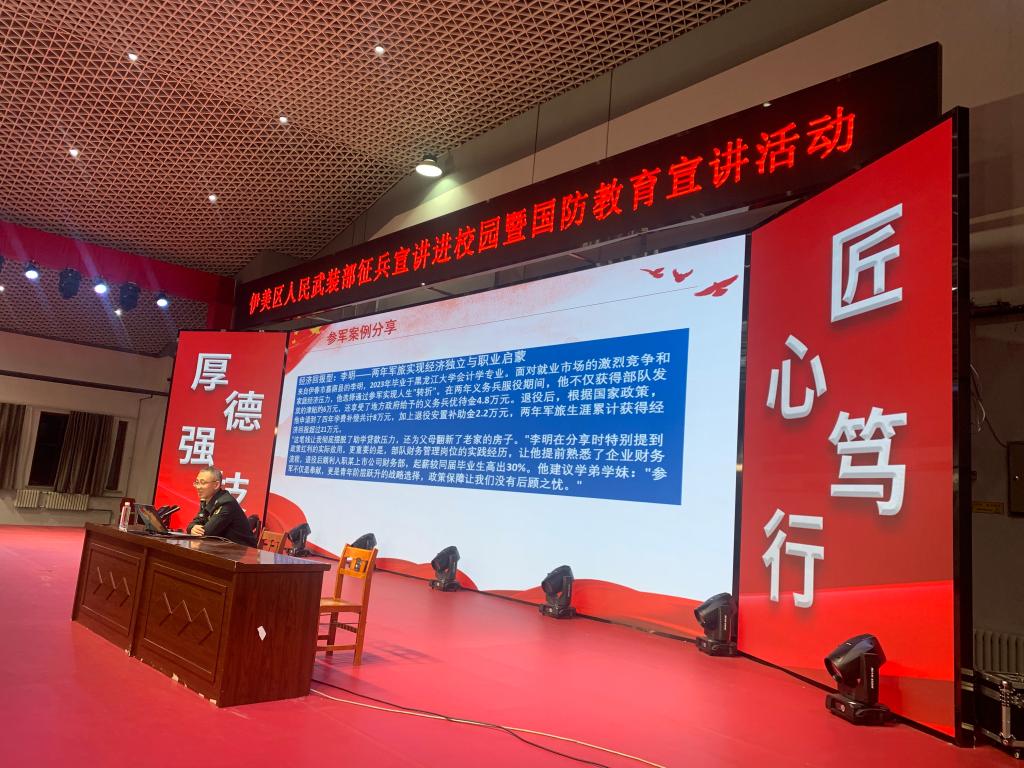 为深入贯彻习近平强军思想,全面普及国家征兵政策,激发青年学子参军报国、奉献国防的热情,推动征兵宣传工作走深走实,强化大学生国防安全意识,压实责任担当,近日,我校联合伊美区人民武装部开展了2026年征兵宣传进校园暨国防教育宣讲活动。各学院有入伍意愿的500余名学生参与活动。